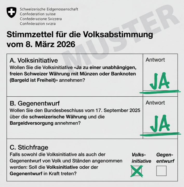 Die eidgenössische Volksinitiative «Bargeld ist Freiheit», über welche wir am 8. März 2026 an der Urne abstimmen können, ergänzt Art. 99 unserer Bundesverfassung (BV) so, dass der Bund verpflichtet wird, Münzen und Banknoten jederzeit und in ausreichender Menge bereitzustellen.