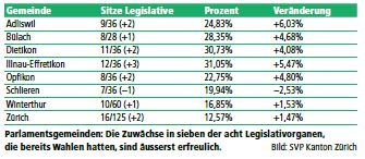 Obwohl es die SVP in gewissen Städten erfahrungsgemäss schwerer hat, stimmt das vorläufige Gesamtbild sehr positiv. Besonders erfreulich sind die Zuwächse in sieben der acht Legislativorganen, die bereits Wahlen hatten. Hervorzuheben sind die Resultate in Illnau- Effretikon, Adliswil, Dietikon, Opfikon und Zürich, wo die SVP ihre Vertretung klar gestärkt hat und jeweils mindestens zwei Sitze gewonnen bzw. vielerorts zwischen vier und sechs Prozentpunkten zugelegt hat. Je einen Sitzgewinn verzeichnen die SVP-Fraktionen in Bülach und Winterthur.