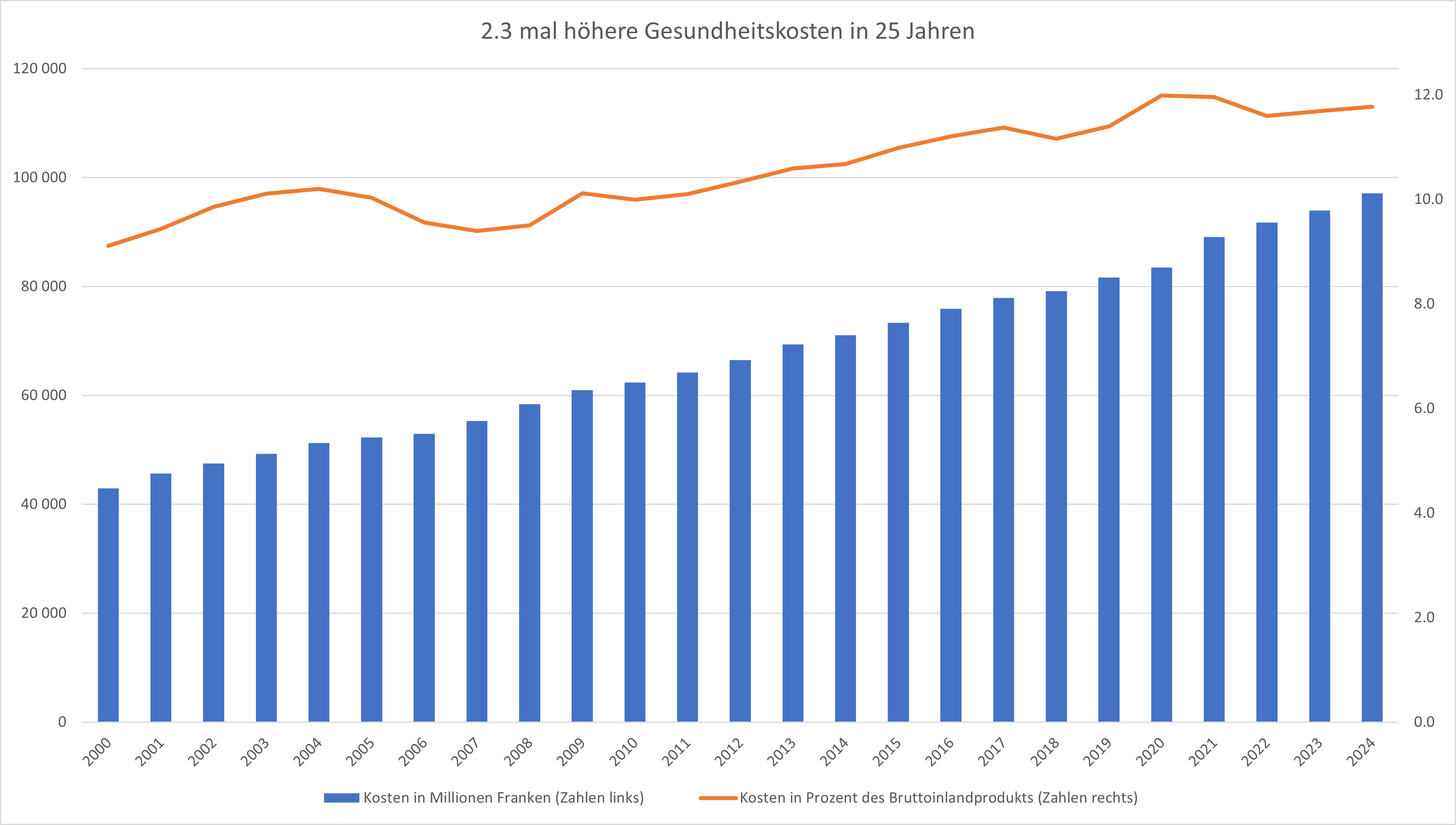 Die Gesundheitskosten sind in den letzten 25 Jahren massiv gestiegen. Quelle: Bundesamt für Statistik (BfS) , eigene Darstellung